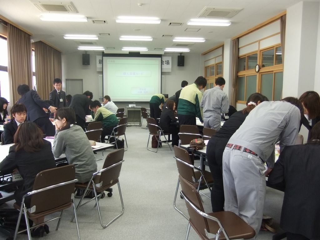 9:00から、企業人の心構え等を話をした後、「企業人として重要な事は?」のテーマにてグループ討議とこの半年間の個人目標カードを作成してもらった。
