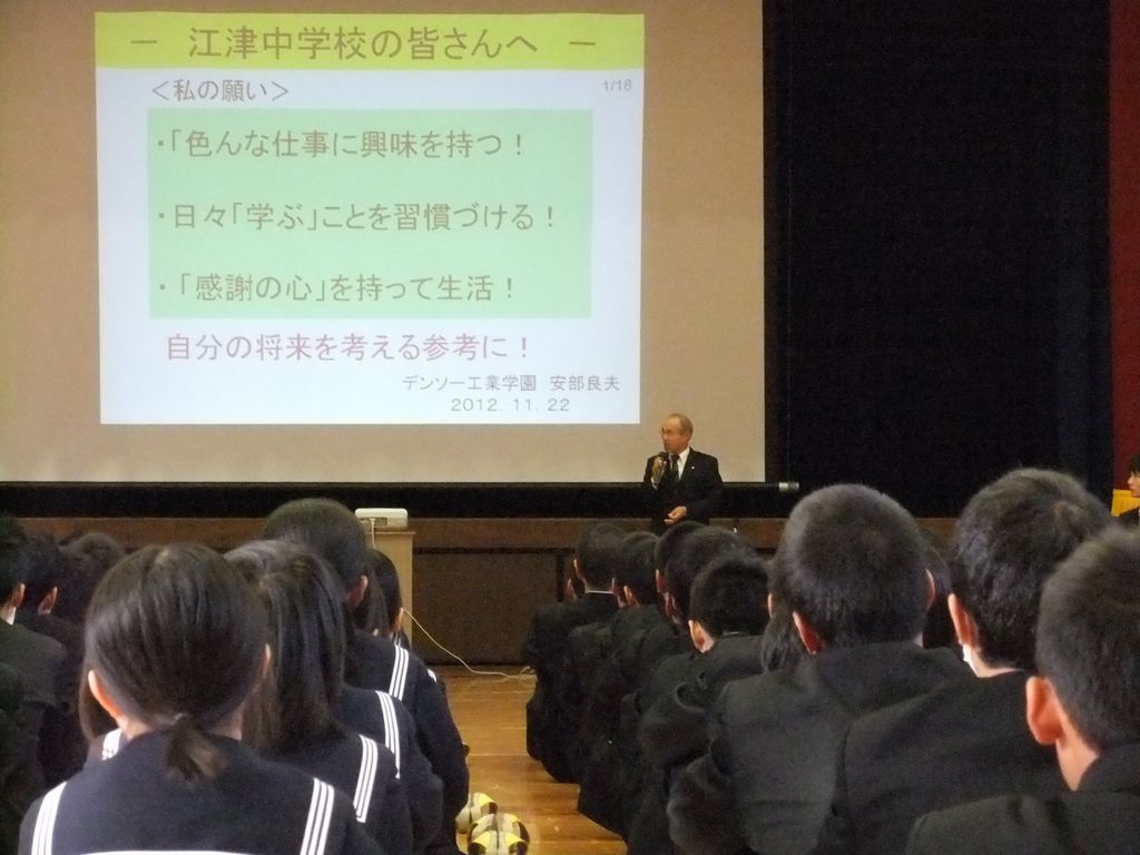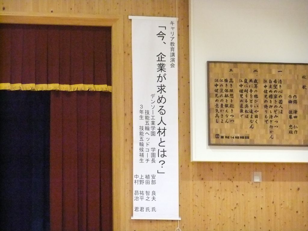 キャリア教育として、デンソー工業学園(デンソーが経営する工業高校)の安部学園長、技能オリンピックヘッドコーチ、3年生2人が来校しての講演が開催された。