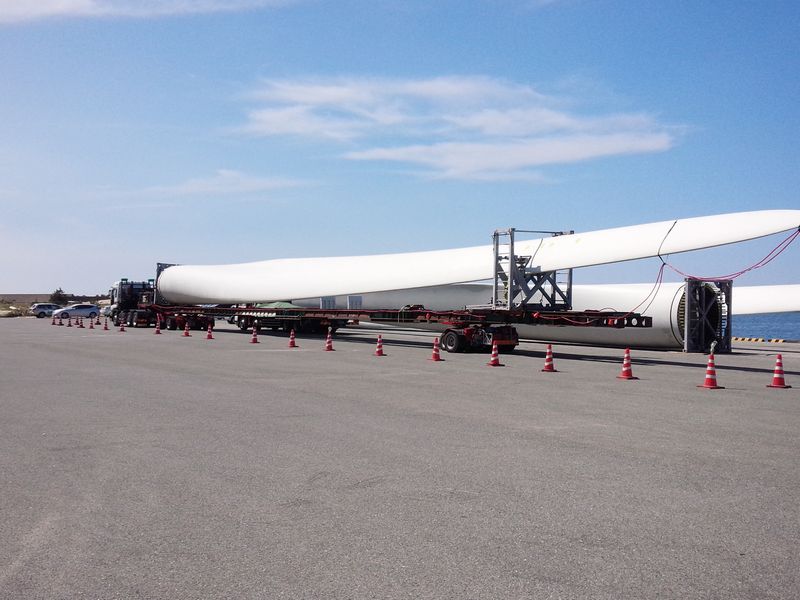 風力発電所の羽根が嘉戸の波止に荷揚げされていた。