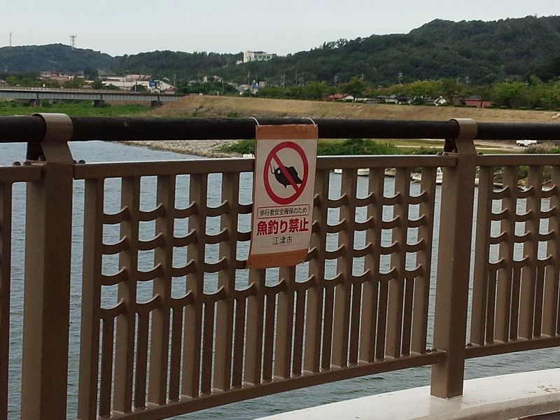 なんと、歩道の少し広くなっている所に、「釣り禁止」の看板。