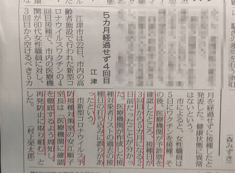 記事によると、江津市のある医療機関において、4回目の接種時に、3回目から5ヶ月経過の条件より2日ほど早く接種してしまった。というもの。