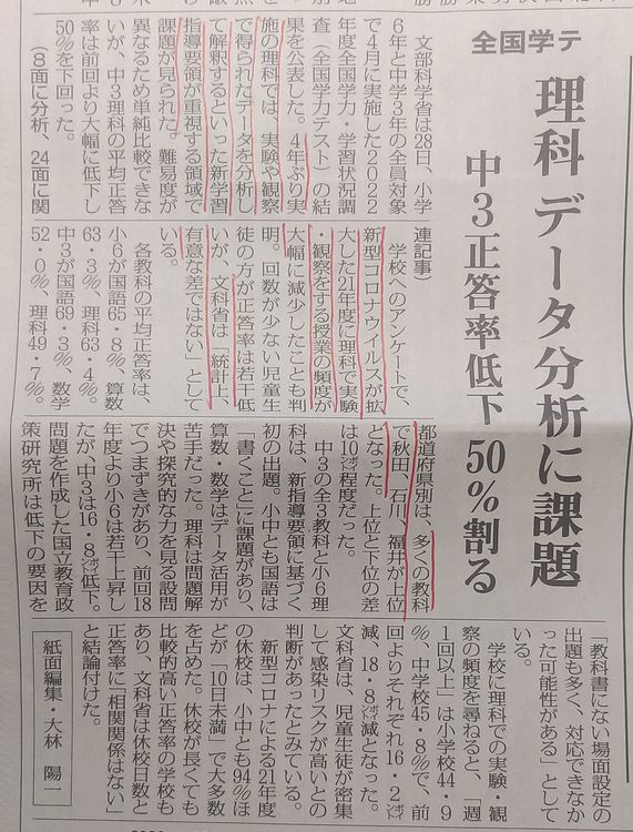 更に、理科の成績については、「コロナの為に、理科の実験や観察をする授業の頻度が低かった。」と。