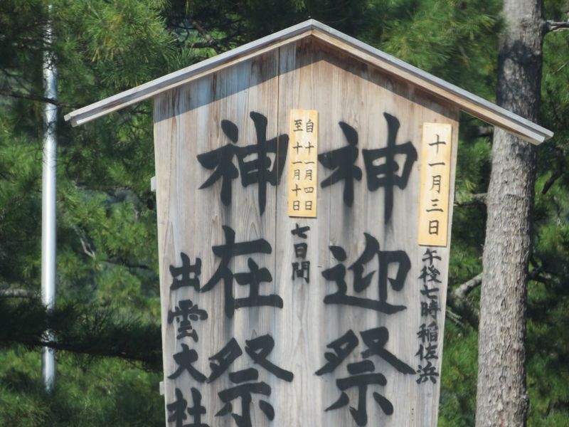 全国的には、神無月ですが、島根は神在月である証拠と思ったのですが、全国の神様が集まるのは、旧暦での行事ですので、右上に小さく11月3日午後7時稲佐浜 神迎祭、11/4から10 の7日間神在祭とありました。