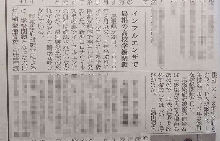 インフルエンザで、島根県の高校で学級閉鎖が発生した様です。