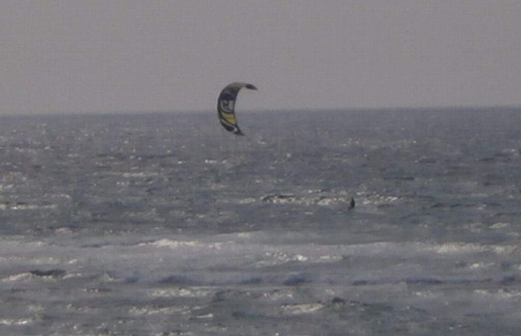 なんというスポーツか知りませんが、ハンググライダーみたいなもので風を受けて、水上スキーみたいなもので海面を進んでいるものを見た。
