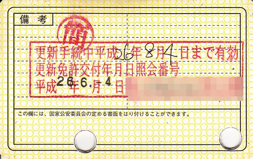 無効の穴が開けられたものの、新免許を受け取るまでの有効期間が裏面に書かれた。
