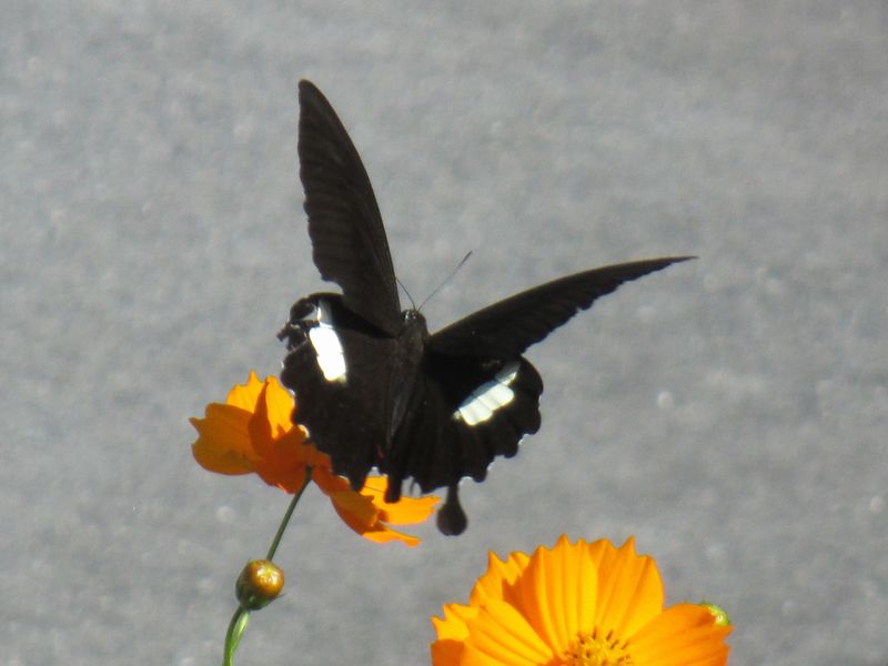 土手の傍では、コスモスみたいな花にアゲハチョウが、せっせと蜜集め。