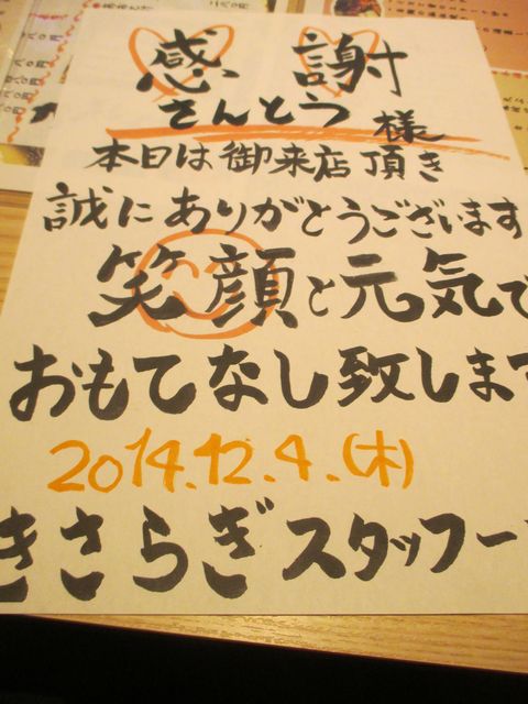 「お待ちしていました、こちらにどうぞ。」と通された席に、下記の紙が置かれていた。