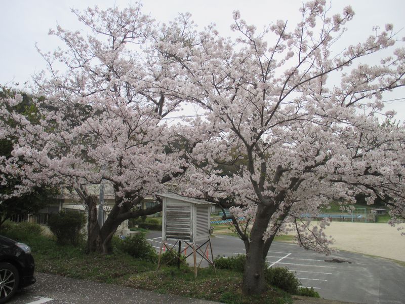 夕方、郷田小学校の体育館前の桜は、昨日の雨で少々散ったものの(地面に花びらがかなり落ちています。)、まだ満開