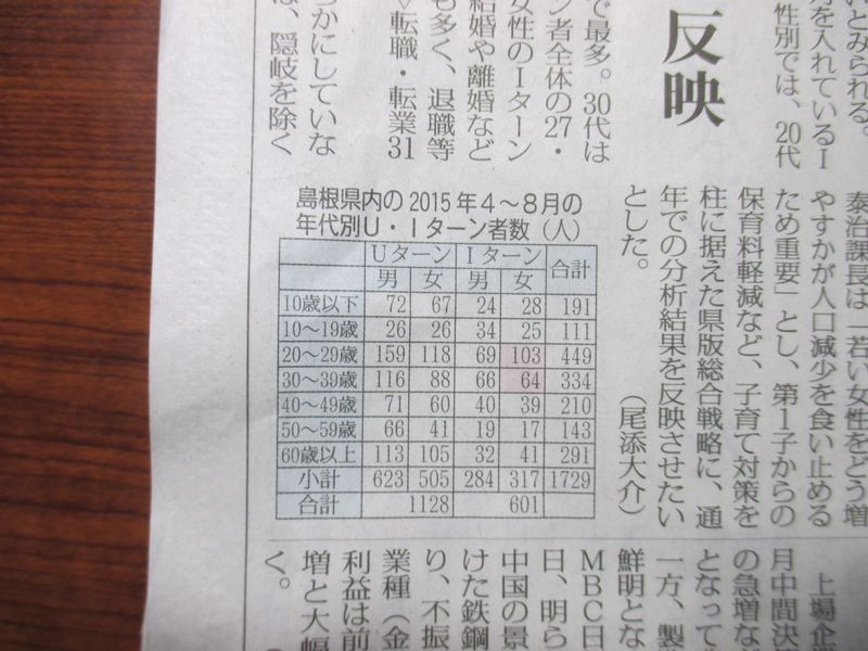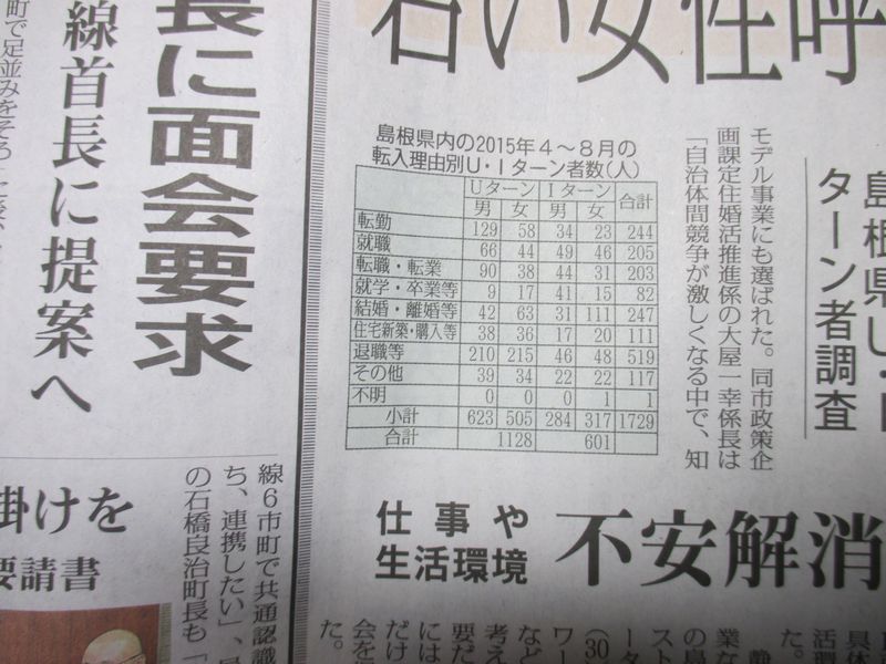 また、新聞記事上では、U・Iターン者1729人の内、転入理由の内 退職等が519人と最多。
