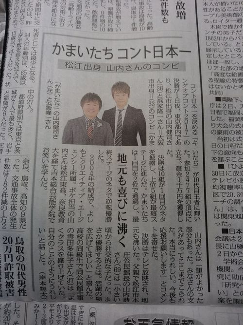 今日の地元紙に「かまいたちコント日本一」との見出しの記事。