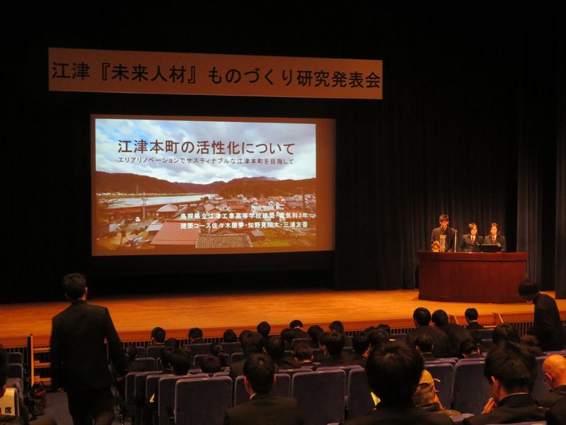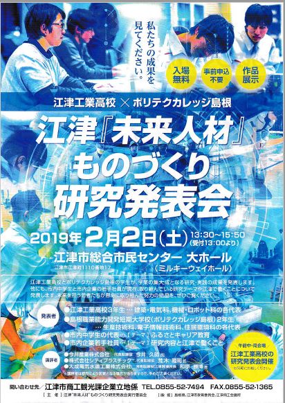 江津工業高校、ポリテクカレッジ合同での「未来人材ものづくり研究発表会」がミルキーホール開催された。