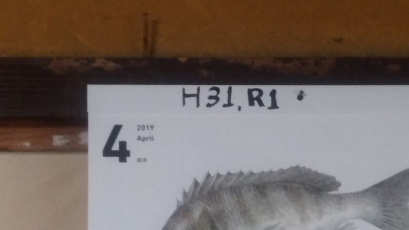 今年は、元年ですので間違いは無いとは思いますが、カレンダーの綴じ代の部分に、”H31”と並べて”R1”を追記しました。