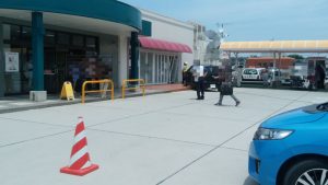 「駐車場で、何かしらイベント?」と思いつつ、少々遠くに駐車し、店の出入り口に向かうと、何と、店舗入り口横にある店舗に軽自動車が飛び込んでいた。