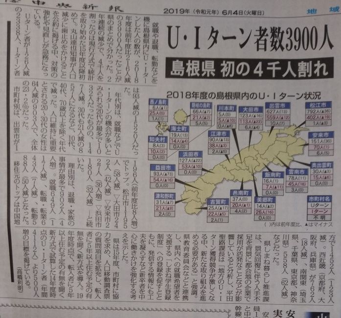 島根県のU・Iターン者が4000人を割り込んだ様です。