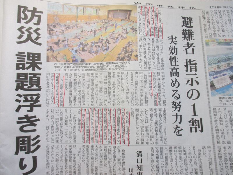 というのも、昨年7月7日の広島県等で豪雨があった時に、江川の水位が結構上昇し、私の住んでいる地域(江津町)にも避難指示が出たものの、避難者はほとんどいなかった事で、新聞記事が、住民の意識の低さを書いていた。