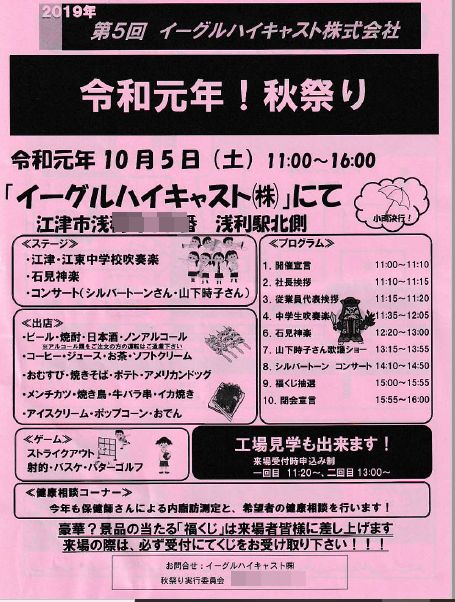 午後から市内のイーグルハイキャスト(株)が、地域に工場内を開放しての秋祭りを行うとの事で、出向いた。