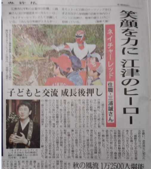 今朝の朝刊に「笑顔を力に 江津のヒーロー ネイチャーレッド」との記事