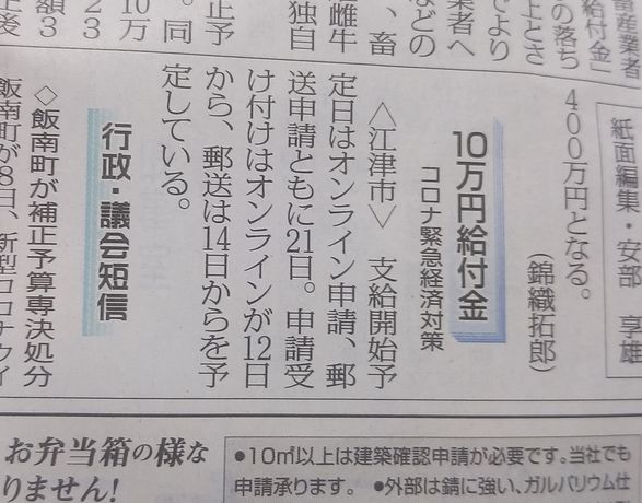 江津市のコロナ緊急経済対策での10万円給付金の支給日程が決まった様です。
