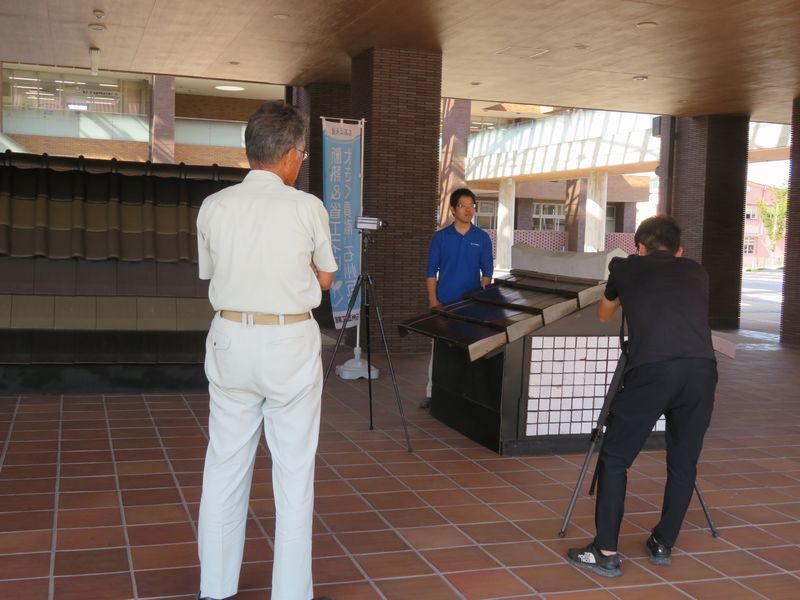 今日は、市内の木村窯業所の瓦を展示しての撮影。