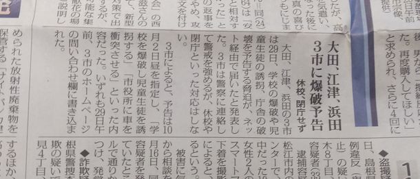 今日、12:30 江津市、浜田市、大田市の小中高の爆破し児童生徒を誘拐する、更に13時30分に、トラックが各市役所に突っ込むとの予告がありました。