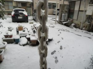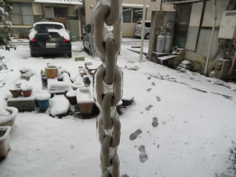 我が家の裏のベランダから雨水を流すためにチェーンを設置しているのですが、見事に凍り付き棒になっていました。
