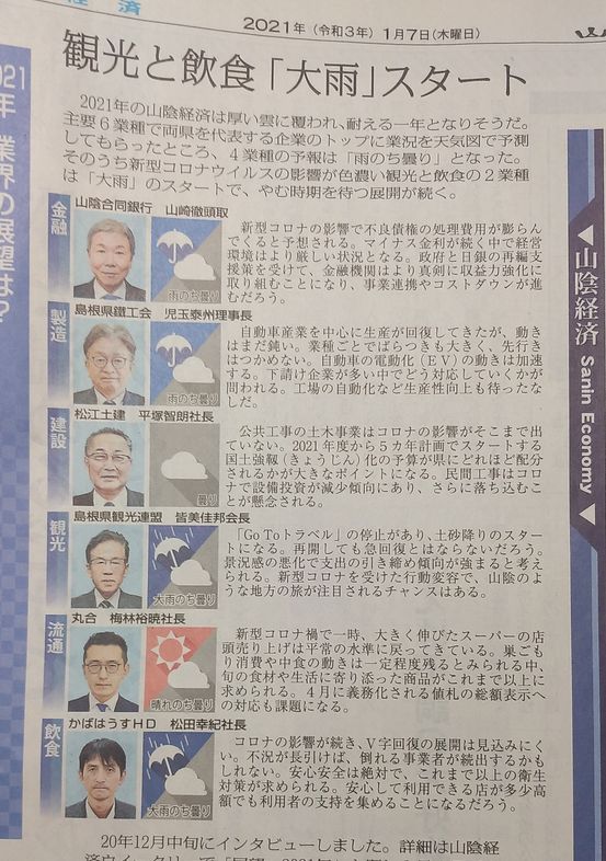このコロナ禍において、山陰中央新報に、山陰地区の今年の経済予測が出ていました。