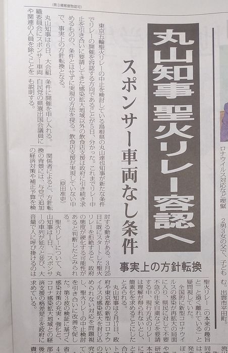 報道では、大阪市の聖火中止と島根県の聖火中止を並べて報道する所もありますが、その真意等は、全く異なっていると思います。