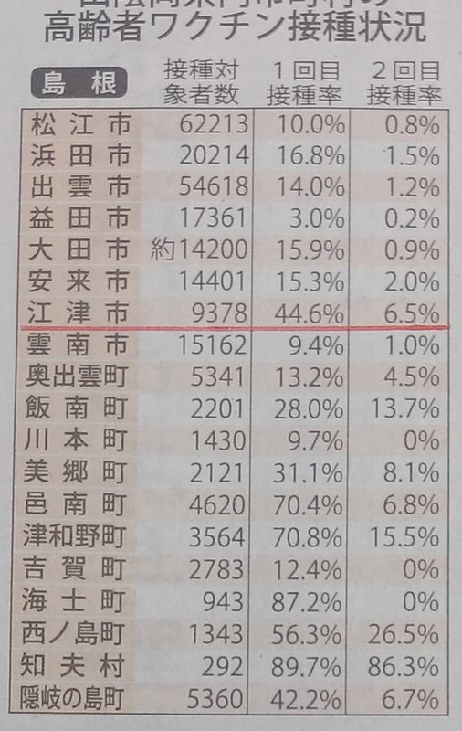 今朝の新聞に、島根県内の各市町村のコロナワクチン接種状況が出ていました。