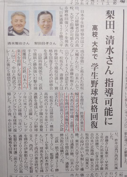 その中に、我が母校からは、梨田先輩と、昨年の東京五輪の日本代表の守備・走塁コーチを務めた清水雅治さんの2名が認定された。と。