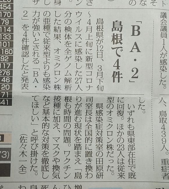 今朝の朝刊に、島根県のBA-2の感染状況の記事がありました。
