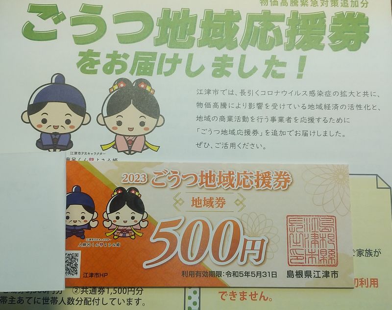 江津市から”ごうつ地域応援券”5000円分が届きました。