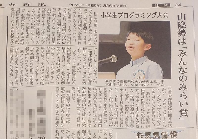今朝の新聞記事に、独自の発想によるプログラムで製作したアプリやロボット等を競う「2022年度全国選抜小学校プログラミング大会」が開催され、島根代表者が「みんなのみらい賞」になった。と。