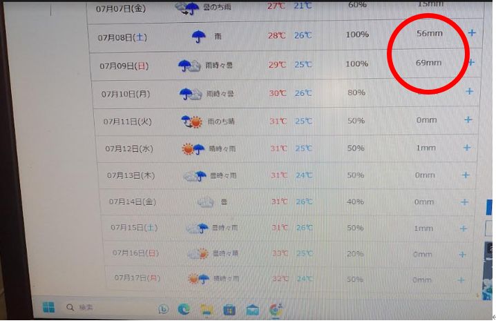 数日前に、同じ画面を見た時は、11日から晴れマークが続き、「梅雨明けか?」と思っていましたが、再び傘マークが増えて来ました。