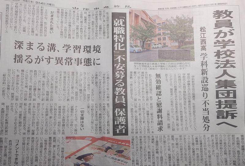 松江西高校(私立高校)で、来年度からの学校方針を巡り、運営側と教員等の間で裁判沙汰になっている様です。