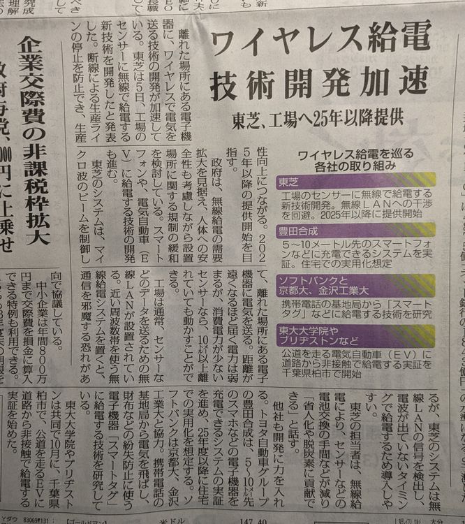 今朝の朝刊によると、ワイヤレス給電技術開発が加速している。と。