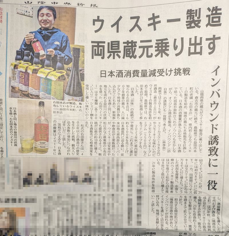 島根県初のウィスキー製造を益田市の蔵元が乗り出し、「右田ウイスキー」を販売を開始した。と。