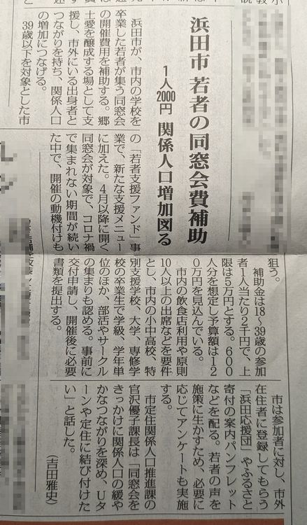 勿論、この事業が悪いとは言いませんが、同窓会に補助金を出して、何とか関係人口を増やし、少しでも人口増加等の効果があればと、少ない予算をやりくりしている記事と、あまりにも違い過ぎて・・・。