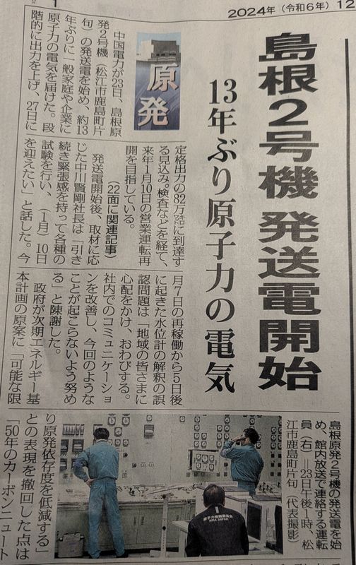 島根原子力発電所2号機が、試運転中ですが、13年ぶりに発送電を開始した。と。