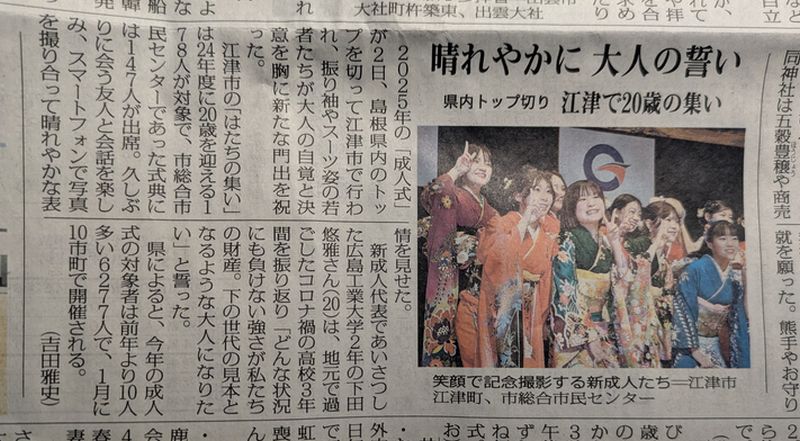 1/2に県内トップを切って、「はたちの集い」が開催された。との記事が。