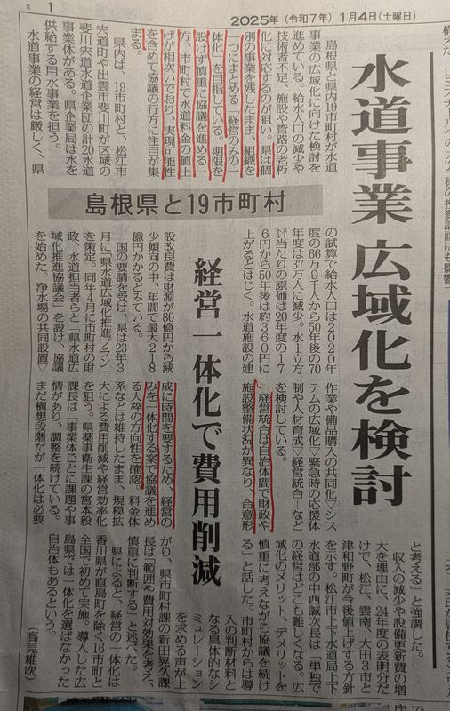 島根県と県内19市町村が水道事業の広域化に向けた検討を進めている。と。