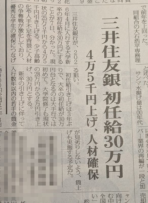 三井住友銀行が学卒と院卒の初任給を30万円にすると。