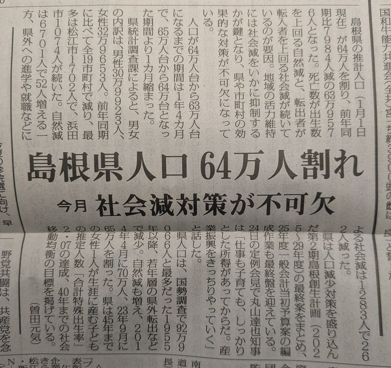 今年の1/1現在の島根県の推定人口が、64万人割れとなった。と。