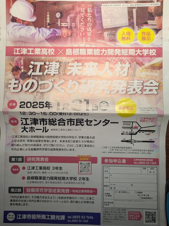 今日、江津工業高校、ポリテク(島根職業能力開発短期大学校)の江津「未来人材」ものづくり研究発表会に出かけて来ました。