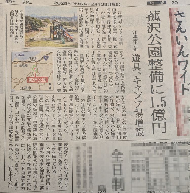 江津市は、市内の東側にある菰沢公園整備に1.5億円の予算を計上する。と。