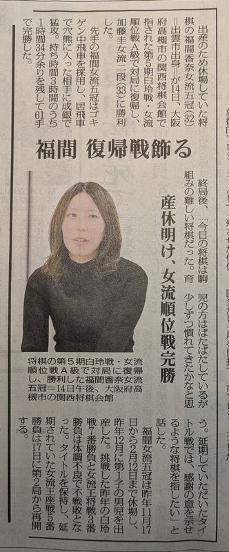 女流タイトル者としての初の出産で、ルールの整備が出来ておらず、妊娠による体調不良での欠席での不戦敗等が続き、やっと将棋連盟も改革に取り組み始めた様です。