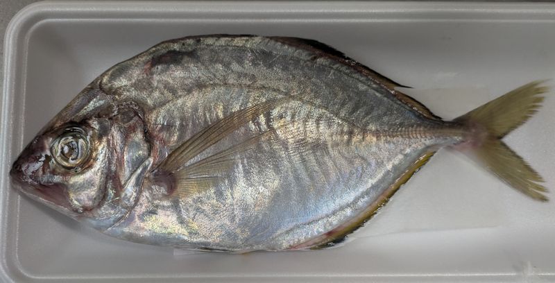 そんな中、下記写真の「ヒラアジ(標準和名はカイワリ、メッキと呼ぶ地域も)」が、何と2枚で、380円(25cm程度の大きさ)。