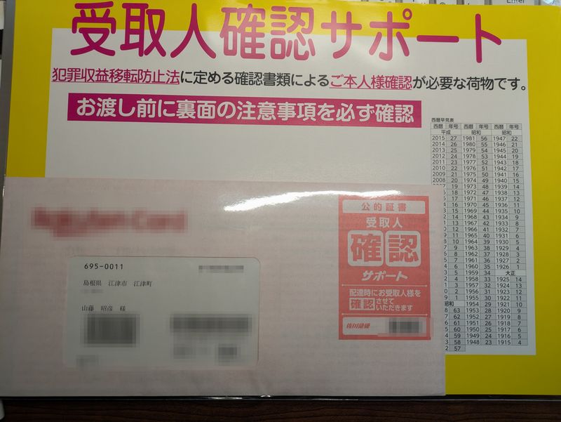 受け取りに際に、免許証かマイナンバーカード等の提示を求められ、その意図の説明されました。