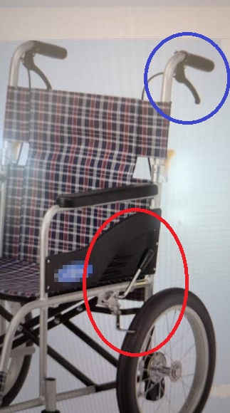 介助用となっていますので、青丸のブレーキ部は、ロック機能が有っても良い感じがします。(写真では無い様に見えます。)