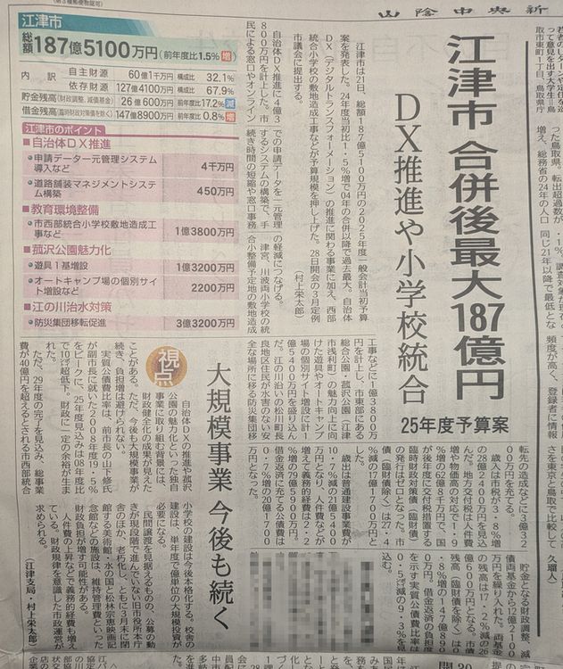 今回は、行政のDX化、小学校統合と大きい支出も有る様です。
